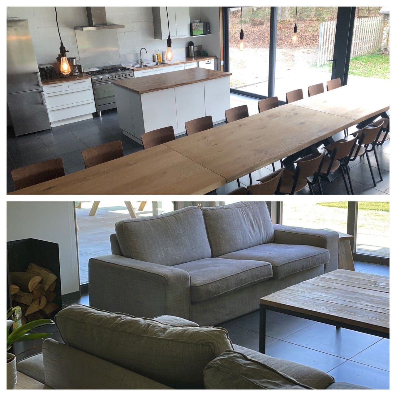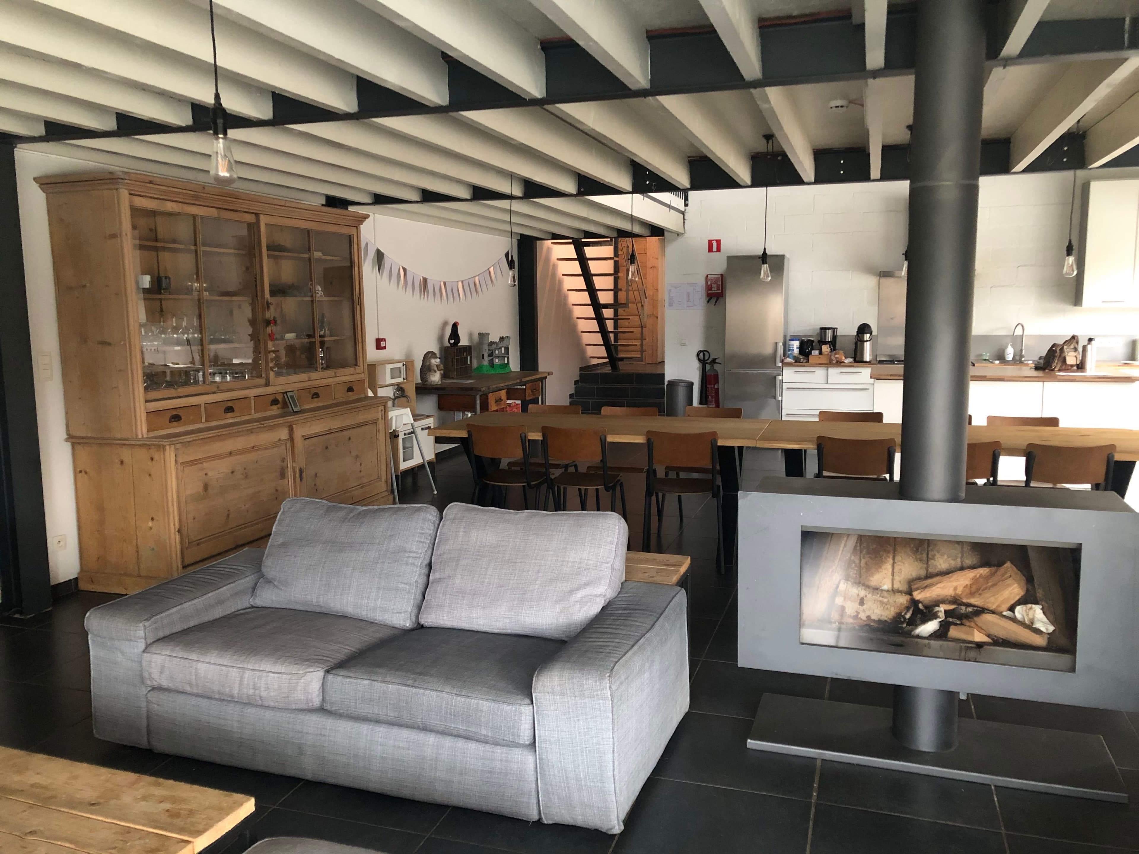 Tussen keuken en zithoek staat een gezellige 360° draaiende houtkachel. Verder zijn er meerdere zitbanken te vinden en kan je uiteraard heerlijk genieten van het uitzicht op de tuin.